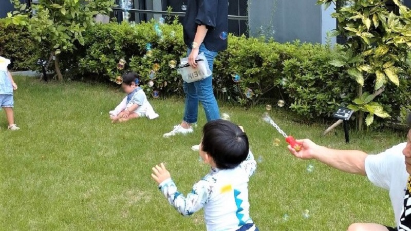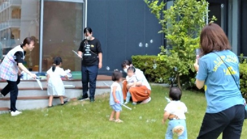 8月20日(日曜日)10時00分から、地域の子育て家庭の親子10組(子ども13名・保護者17名)を迎えて、大学内にある子育て支援室にて『シャボン玉あそび』を行いました。日曜日の開催とあってお父さんの参加が多く、お父さん方のパワーと工夫で庭いっぱいにシャボン玉を飛ばすことができました。