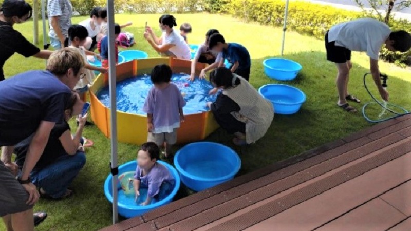子どもたちは、暑さも気にせず、キラキラと輝くシャボン玉に声をあげながら駆け回っていました。参加した子どもたちは、8か月から5歳までさまざまでしたが、お父さんやお母さんの真似をして、道具を使って試行錯誤する様子もありました。保育科の学生たちもお子さんの様子に反応しながら触れ合うことができ、親子のかかわりに寄り添うことの大切さを学ばせていただきました。