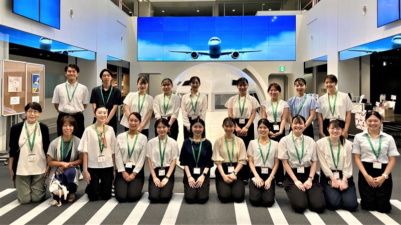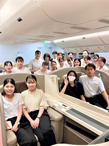 本年度は、8月30日(水曜日)に18名の外国語学部生が研修に参加しました。研修では、実際にJALの客室乗務員の訓練用の機内を見学しながら、客室乗務員の訓練の様子を聞かせていただきました。また、スカイミュージアムや機体整備工場見学では、空港における様々な仕事の内容や飛行機の機体などについても詳しく教えていただきました。