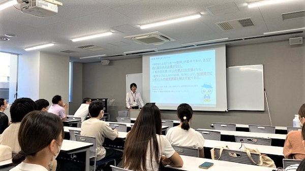当日は、事業全体の目的・内容・役割分担・スケジュールの全体共有を行い、あわせて『中小企業の経営課題解決の新たな選択肢-副業・兼業人材活用』のテーマで富士信用金庫の取り組みをご紹介いただきました。小豆川ゼミからは、「人の力を最大化・生産性を高める」のテーマで、健康経営の推進、生成AIなどテクノロジーの活用、社内副業制度の事例紹介を行いました。