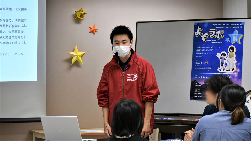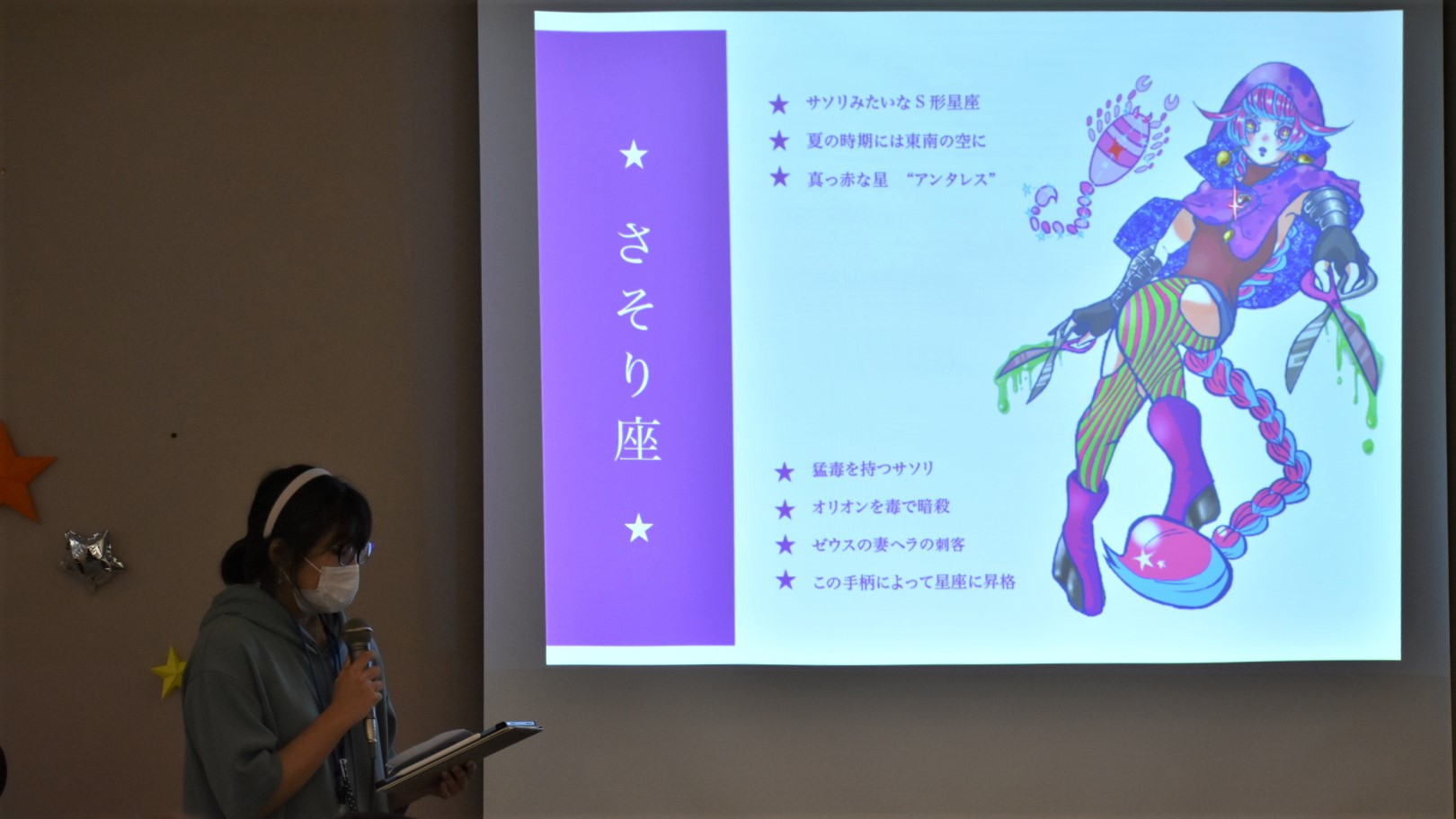 今回は『夏に見える星座』をテーマに、ディスカバリーパーク焼津天文科学館の鈴木怜音さんが講師を務め、星座の楽しみ方についてお話いただきました。また、学生が6種類の夏の星座(琴座、鷲座、白鳥座、天秤座、蠍座、射手座)のキャラクターを制作し、星座にまつわる神話について、キャラクターと合わせて紹介しました。