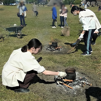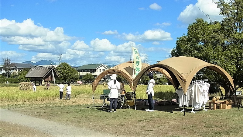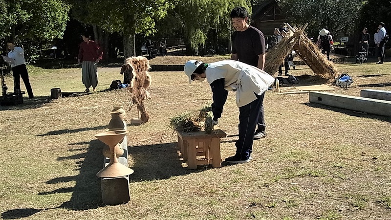 来場者の稲刈り体験、弥生式土器(復元)での古代米の炊飯体験、そしてコンサートでの奉納儀式などをお手伝いしました。
