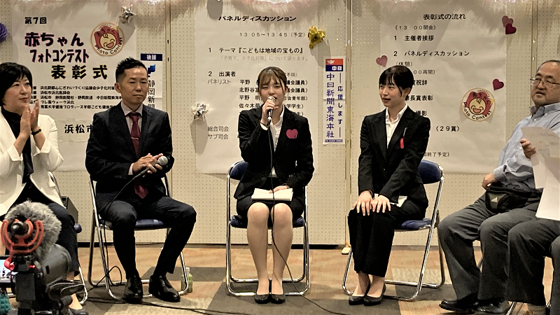 また、表彰式の前にはパネルディスカッションが行われ、市議会議員や商工会議所の方、児童精神科の先生の中に交じりパネラーとして学生2名が参加し、《こどもは地域の宝もの》というテーマのもと、子育てや少子化対策について語り合いました。