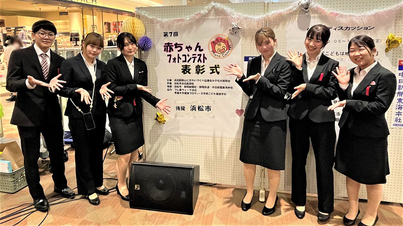 今回は、こども健康学科の地域貢献サークル『Sun&Leaf』の学生7名が活動の一つとして、浜北区役所・区振興課と連携し、会場の設営、装飾、受付や座席誘導などを行い、表彰式での司会進行やプレゼンターの補助も行いました。