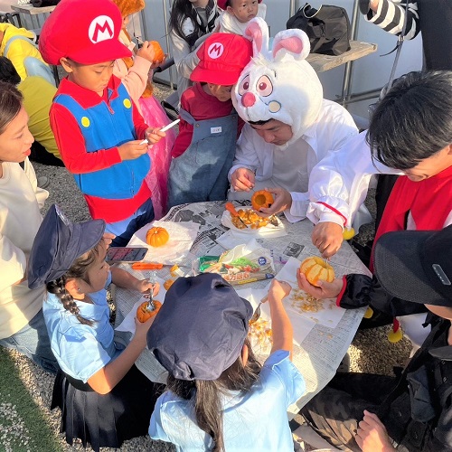 昨年に引き続き2年目の開催となる今回は学生も子どもたちも思い思いの仮装をする仮装行列や、普段、なかなか経験できないかぼちゃのランタン作りをはじめ、Trick or Treat(ゲーム)や、ジャンボリミッキーのダンスを行いました。