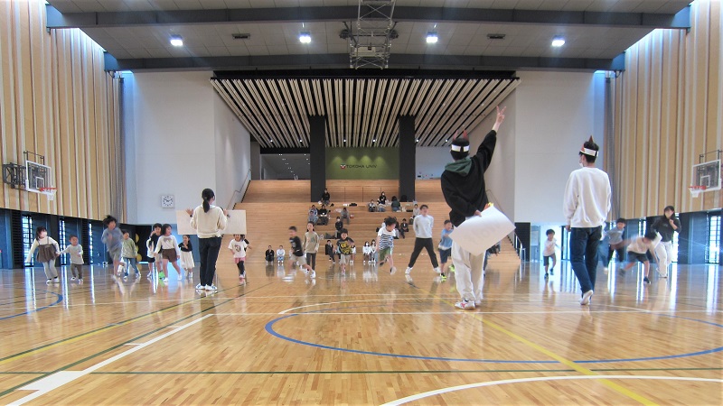 時期がハロウィンに近かったことから、学生たちは、全てのゲームをハロウィンバージョンにアレンジして行ました。参加してくれた子ども達は、アリーナの中をたくさん走り、体を動かしながら英語に親しむことができたほか、最後のゲームは保護者と子どもが一緒に活動をしたことから、親子一緒に英語に親しむこともできました。