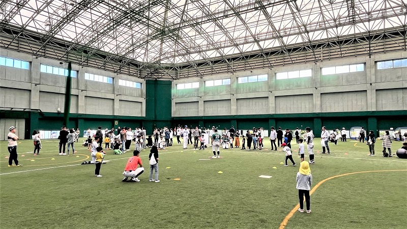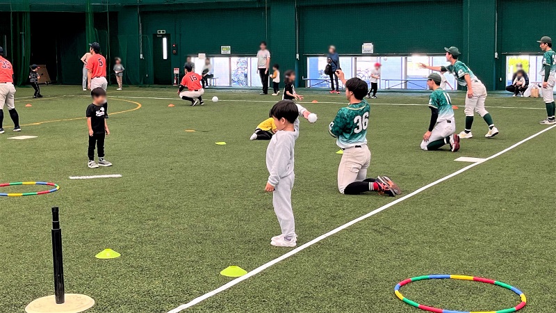当日は、ドラゴンズベースボールアカデミーと横浜DeNAベイスターズベースボールスクールから2名のコーチが講師として来場。日本野球機構の講師も加えてイベントがスタートし、午前中に開催された1部には52名、午後に開催された2部には45名の子どもたちが参加しました。参加した子供たちは、最初は慣れない環境に戸惑う子どももいましたが、講師や大学生と触れ合うにつれて笑顔になり、グループに分かれて体操やランニング・キャッチボール・BTボールを楽しんでいました。子どもたちを見守る保護者の皆様からも自然と笑顔がこぼれ、会場は和やかな雰囲気となりました。