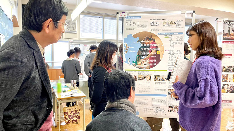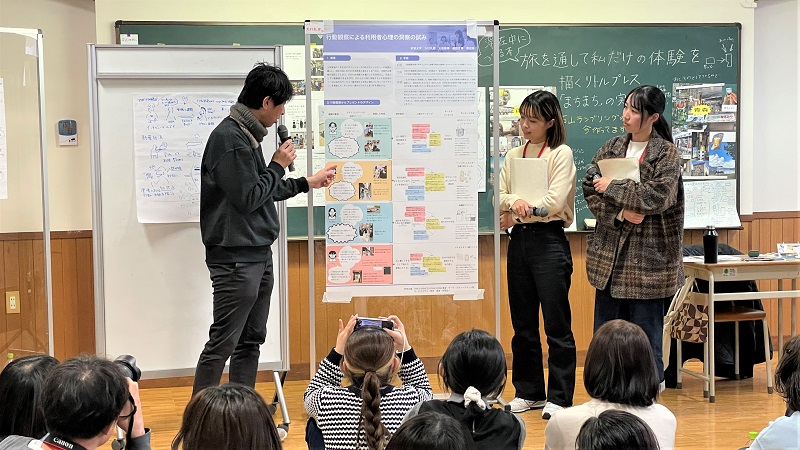 『自立共生の暮らしを見つめる実験』野本七海さん(4年)は、都市部の女性たちへの食生活インタビューや、熊本県の五木村に滞在して『小さく勝手につくる』を体現している人々への参与観察を経て、ソーシャルイノベーションに関する考察を語り、多くの大学教員との間で活発に意見を交換しました。