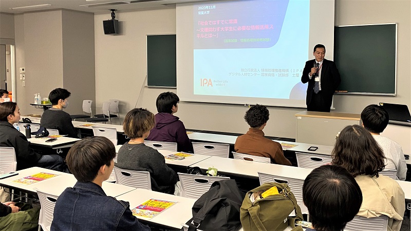 『社会ではすでに常識~文理問わず大学生に必要な情報活用スキルとは~』と題して、情報処理技術者試験の体系、企業とITの関係、Society 5.0・AIセキュリティに関する説明、事例紹介がありました。あわせて国家試験の活用理由、ITパスポート試験の受講実績、さらに本試験を活用する企業事例の紹介がありました。