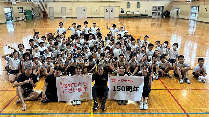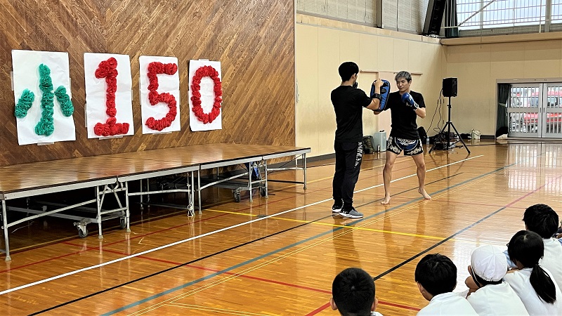 また、開校150周年を迎えた入野小学校へのお祝いとして、プロキックボクサーとして活躍する遠藤武寛さん(心身マネジメント学科3年)がミット打ちパフォーマンスを披露し、間近で見るプロ選手の強烈なパンチとキックに、児童からはどよめきと歓声が上がりました。