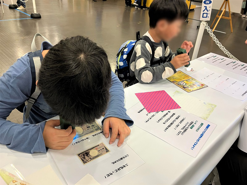 ハンディ顕微鏡を使った観察では、鉛筆で書いた字はなぜ消しゴムで消えるのかを、ペンで書いた字と比較して観察することで理解したり、一般の印刷物と千円札の印刷がどう違うのかを観察したりしました。