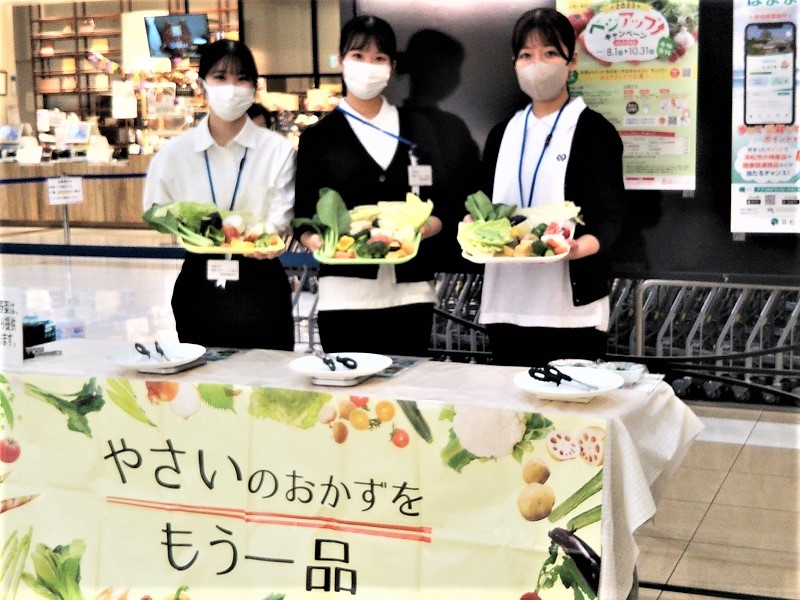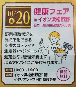 健康プロデュース学部健康栄養学科 公衆栄養学ゼミの4年生6名が10月20日(金曜日)、イオンモール浜松市野店で行われた『健康フェア』に浜松市東区健康づくり課と一緒に参加し、来場者へ野菜摂取についての啓発活動を行いました。