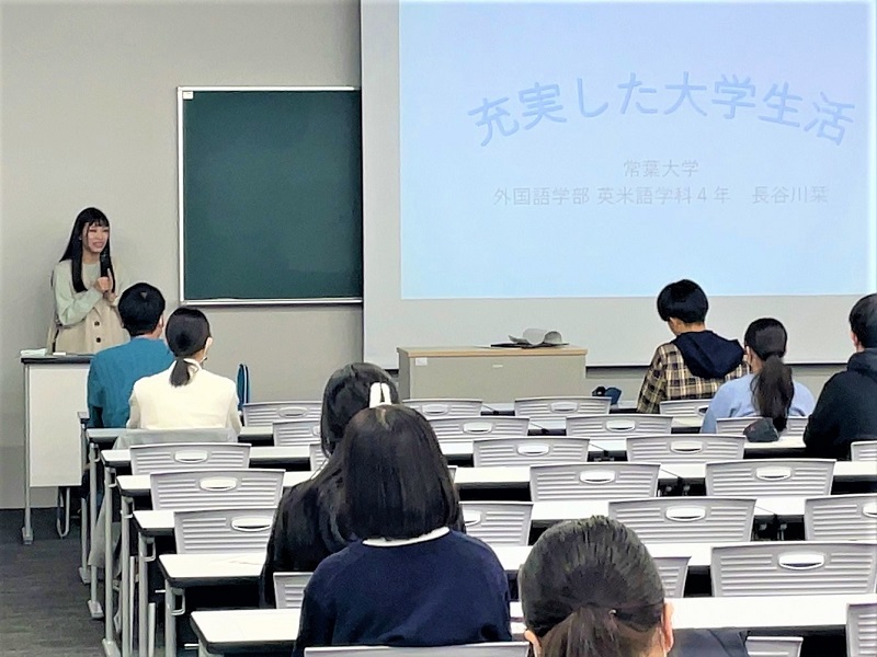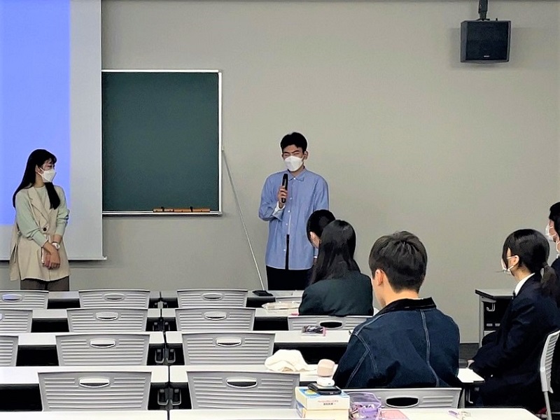 外国語学部英米語学科では、学科のカリキュラム説明の他、先輩学生の体験談を聞き、グループワークでは『大学でやってみたいこと、不安なことや先輩の話を聞いて気づいたこと』を共有しました。最初は、緊張していた様子でしたが、終了後もグループの仲間との雑談が続き、入学するのが楽しみになっているように感じました。