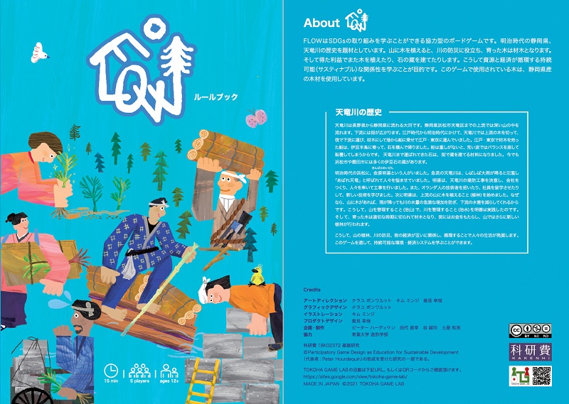 FLOWは協力型のボードゲームで、明治時代の静岡県、天竜川の歴史を題材としています。山に木を植えると、川の防災に役立ち、育った木は材木となります。そして得た利益でまた木を植えたり、石の蔵を建てたりします。こうして資源と経済が循環する持続可能(サスティナブル)な関係性を学ぶことが目的です。
