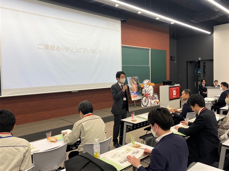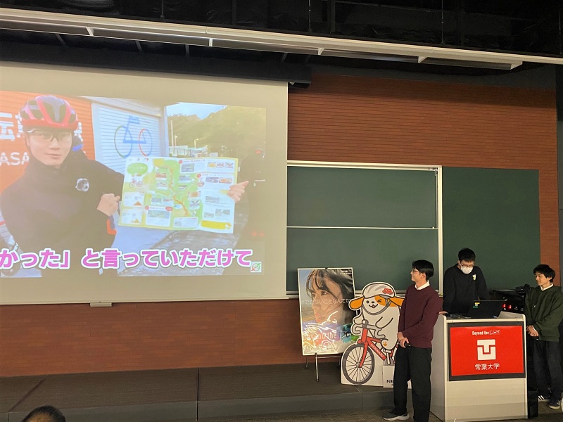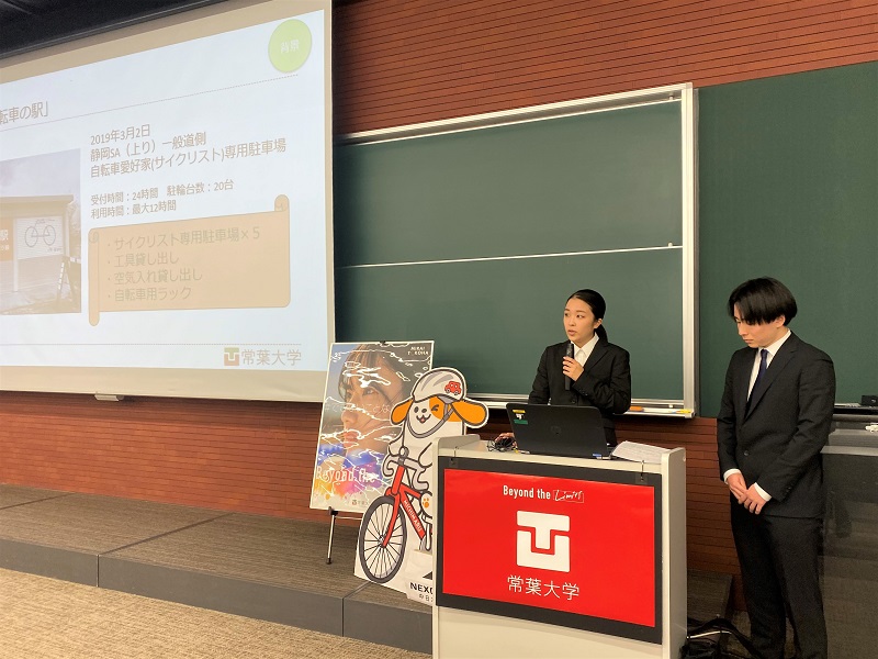 本研究は、新東名高速道路の静岡SAにある『自転車の駅』の認知度向上と、近隣のオクシズ地区へのサイクリング促進、ならびに高速道路の利用マナーの向上を目的としており、4月から学生を主体とした諸活動に取り組んでいました.報告会当日、NEXCO中日本の担当の方々をはじめ、静岡市交通政策課の皆さま、本学の職員の方々に参加頂きました。