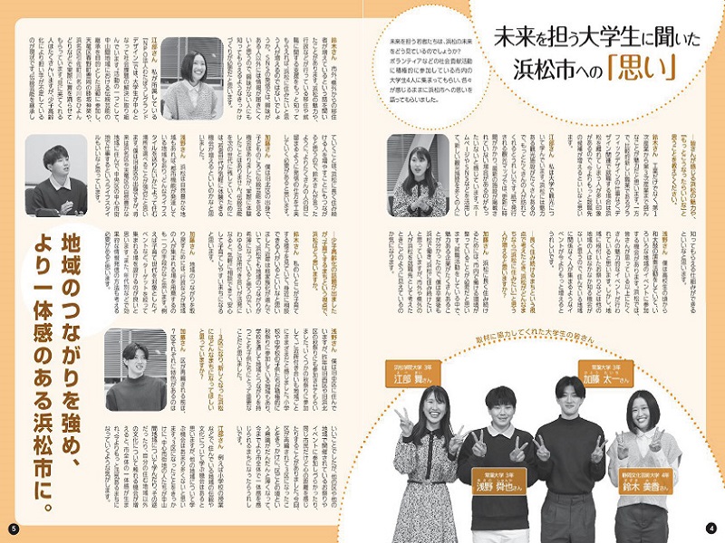 浜松市の区再編に伴い、浜松市広聴広報課から市内でボランティアなどの社会貢献活動に積極的に参加している大学生を取材したいという依頼を受け、浜松市内大学地域貢献ネットワーク(事務局:常葉大学浜松キャンパス)の3大学から4名の学生が参加し、『浜松市への思い』を語りました。
