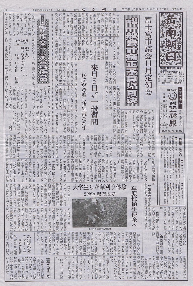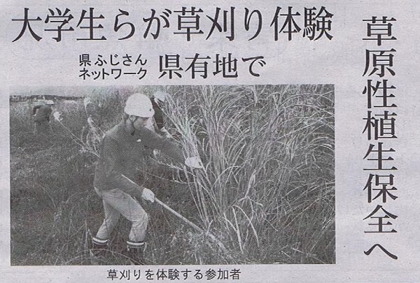 11月25日(日曜日)に静岡県とふじさんネットワークによる富士山草原性植生保全活動に社会環境学部の学生37名が参加し、草刈り体験や生育調査、外来生物の抜き取りを行ったことが、岳南朝日新聞で紹介されました。この活動は富士宮市の根原草原で行われ、社会環境学部の浅見佳世教授と研究室の学生・卒業生を講師とし、草原性植物の大切さを学ぶセミナーも同時に実施されました。