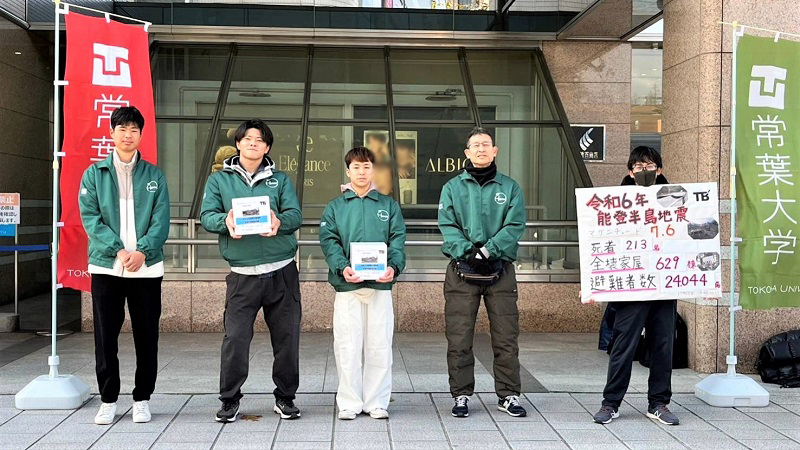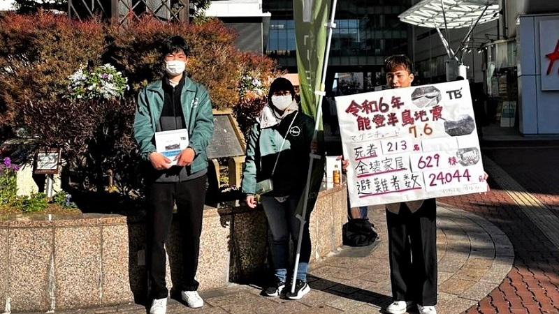 本学ボランティアサークル Thunder Birdsの学生9名が1月13日(土曜日)と14日(日曜日)の両日、JR浜松駅北口広場、遠鉄百貨店付近にて募金活動を行いました。この活動は、1月1日に石川県能登半島地方で発生した地震を受け、被災者や被災地の復興を支援しようと学生たちが企画しました。