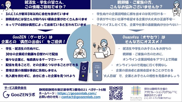 第一回目の開催となる本年度は、市内外から60社以上のスタートアップ・起業家の応募があり、『株式会社GooZENラボ』をはじめとした計5社の企業様を支援企業として採択されました。本学では、この採択された企業のうち、就活生・求職者向け企業紹介動画配信アプリ開発をおこなっている『株式会社GooZENラボ』様とNFTを活用し持続可能な情報発信エコシステムを構築する情報発信とNFT販売の両立ビジネスを企画している『ジオ・マーク株式会社』様の活動を支援しています。