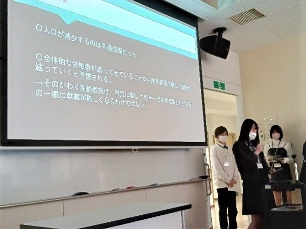 発表で学生たちは、これからの地域社会は「人口減少が進み、働き手が不足することから、外国人労働者が増加する。情報通信技術の発達とともに、市場経済の形態が変化する」と考え、このような地域社会で期待される人物像として「海外経験のある人、コミュニケーション力に長けている人、主体性を持って自ら行動できる人、専門的なスキルや資格を持つ人」などをあげました。