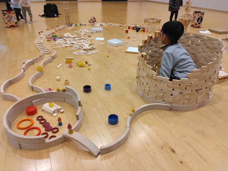 この日は学生と親子がグループになり、子どもたちのアイデアに学生がアドバイスするという形で、思い思いに木製ブロックで造形表現を楽しみました。