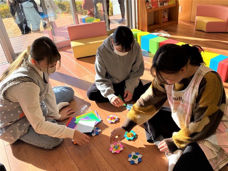 とても小さな『おまつり』ですが、コロナ禍で『おまつり』を味わった経験が少ない子どもたちの気持ちに思いを馳せて、学生有志が準備をしました。当日は未就園児親子が訪れ、手作りのおもちゃで遊んだり、寒さに負けず外で鬼ごっこをしたりして楽しみました。