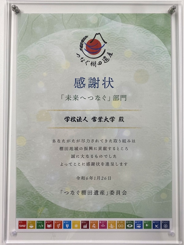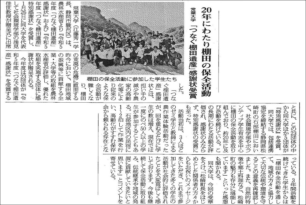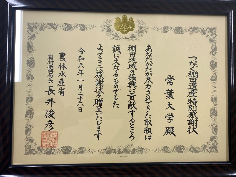「つなぐ棚田遺産」感謝状とは、担い手の減少や農家の高齢化等により従来のような保全活動が難しくなり、棚田の荒廃の危機に直面する昨今において、棚田地域の振興等に貢献する企業・大学等の取組を農林水産省が評価し、優れた取組を実施する団体に感謝状が贈呈される取り組みです。今年度は23団体が『令和5年度「つなぐ棚田遺産」感謝状』を受賞すると共に、この23団体の中から本学を含む5団体が『特別感謝状』を受賞しました。