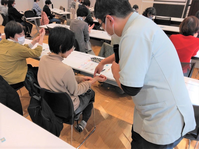 参加者は、まず、食欲不振の際のツボ『足三里』や緊張したときのツボ『神門』を学び、『ソマニクス』という刺さない鍼を貼ることで血流を促進し、痛みを和らげる効果があることを体感しました。次にペットボトルを活用したお灸『ペットボトル温灸』を体験しました。お湯の入ったペットボトルを首の付け根から肩・背中、または、ふくらはぎ・足裏などに押し当て動かすことで温めながら効果的にマッサージすることができました。この日は2人1組で取り組み、お互いにマッサージすることでコミュニケーションも深まり、日頃のストレスを解消することもできたようでした。