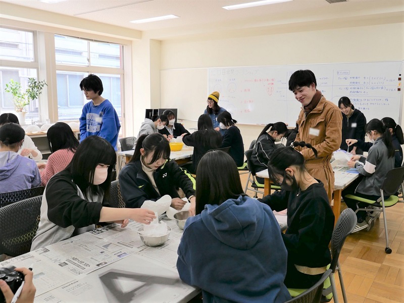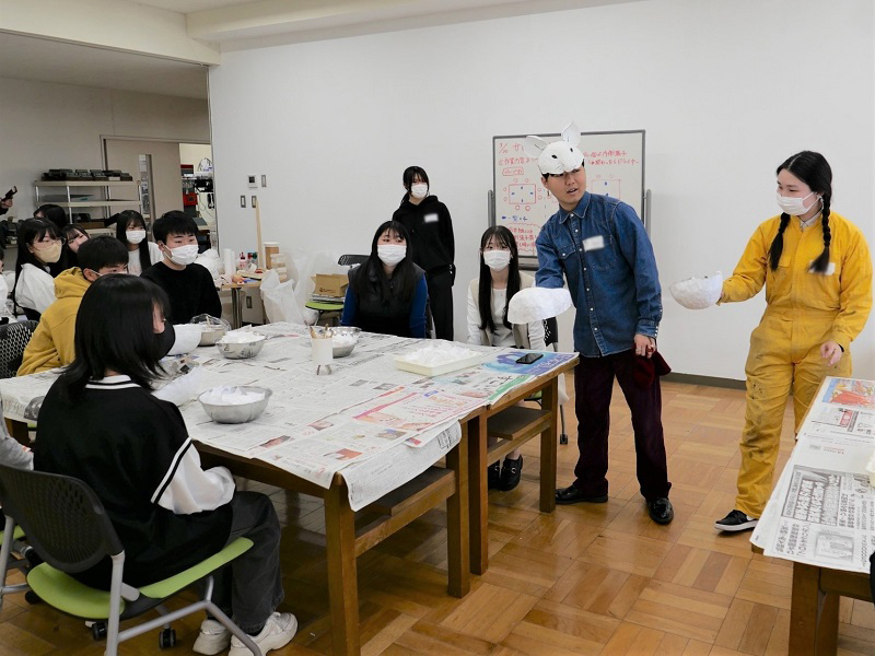 3月20日(水曜日)、静岡瀬名キャンパスで、静岡まつりのボランティア高校生34人が参加して、ワークショップを行いました。ここでは、江戸後期の史料にもとづき、踟の仮装行列に使われるネズミのお面を制作してもらいました。造形学部のアート領域、環境デザイン領域の有志学生が指導役となり、張子のお面40個を手分けして制作しました。