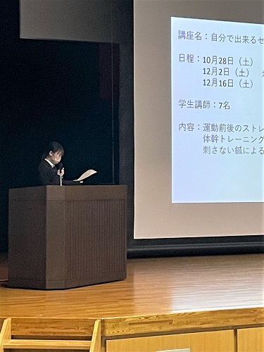 本学からは健康プロデュース学部健康鍼灸学科ボランティアサークルSinQ(しんきゅう)が部活動を行う中学生に対して体幹トレーニングの方法と実践、刺さない鍼によるセルフケアについて講義した内容を報告しました。村木菜桜さん(健康鍼灸学科4年)は、「鍛えることだけでなく、怪我をしないケアを行うことの重要性と、その手法を伝えることができたのは良かった」と活動を振り返りました。