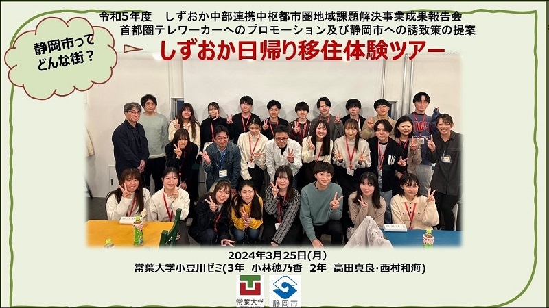 経営学部 小豆川ゼミ(3年生・2年生)20名は、令和5年度しずおか中部連携中枢都市圏地域課題解決事業に採択され、首都圏テレワーカーへのプロモーションおよび静岡市への誘致策の提案に取り組みました。