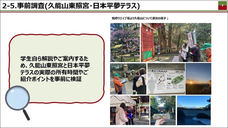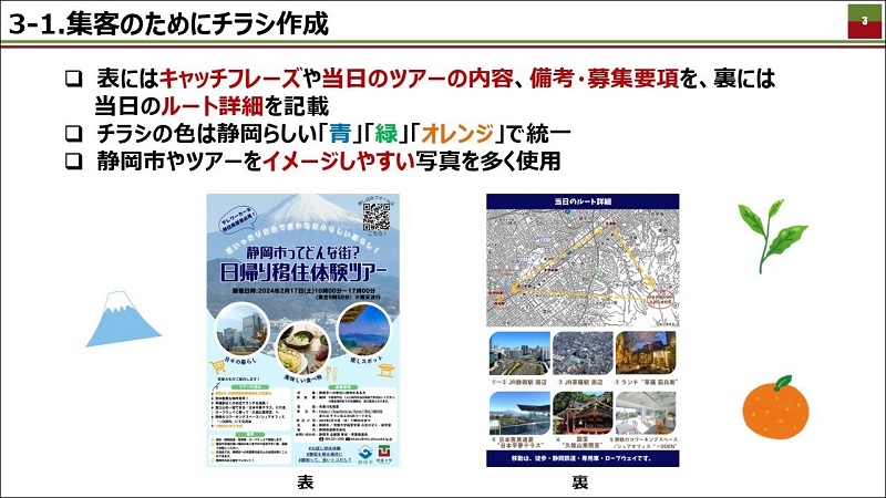 本事業では、学生が静岡市への理解を深めることをはじめとして、静岡市の関係人口を増加させ、移住・定住を促進することを目的としています。静岡鉄道株式会社、株式会社日本旅行、NPO法人駿府ウェイブにもご協力いただき、ターゲット設定や事前研究、チラシ作成、日帰り移住体験ツアーの企画・運営・実施を行いました。ツアー当日には、しずおかの街歩き、住宅物件見学、日本平夢テラス・久能山東照宮の散策を行い、最後に移住体験者や外部の方々を交えた交流会を開催し、ほぼ予定通り進行することができました。