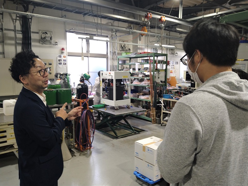 その一環として、常葉大学経営学部林信濃ゼミナールでは静岡県環境衛生科学研究所の静岡県気候変動適応センターと協働し静岡県内の気候変動適応策をビジネスとして活かしている企業の聞き取り調査を行っております。今般、環境衛生科学研究所の神谷主査のご紹介により、㈱エーディーディーを訪問し聞き取り調査を行いました。訪問先では代表取締役の下田社長をはじめ下田専務、飯田常務、そして開発に携わっている鳥越執行役員から詳しい説明を伺い、理解を深めることが出来ました。