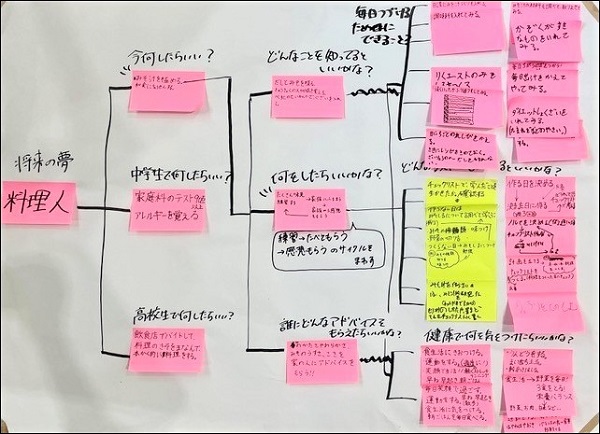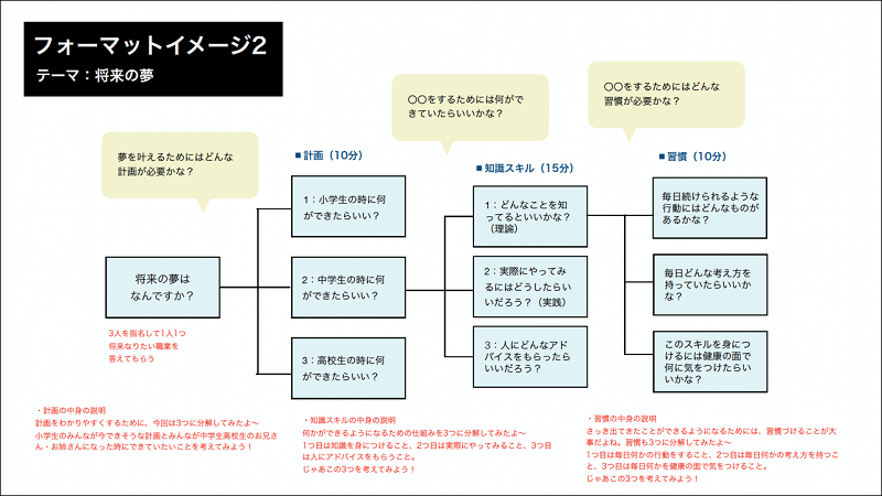 ロジックツリーはビジネスで用いられる問題提起や課題解決のフレームワークです。私たちは小学生が自分ごととして学ぶことができるように大学内で複数回の試作と実験を繰り返しました。その結果、夢を実現するために『必要な計画』『ほしい知識』『続ける習慣』の3段階の構造とし、8名の学生がそれぞれ10名の小学生をファシリテートするためのマニュアルとフォーマットをデザインしました。