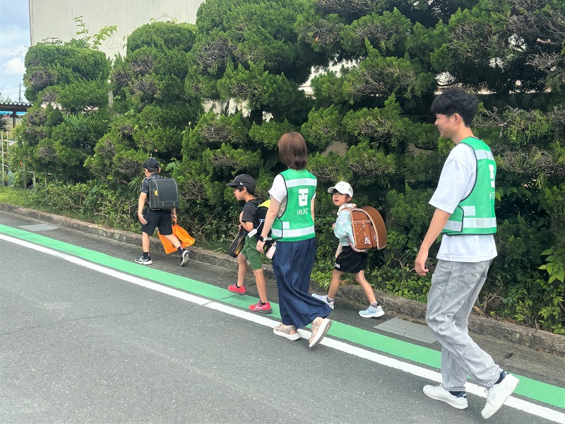 都田小学校は、市内中心部から離れた小学校ということもあり児童数が少なく、学区が広いため1人で遠くまで登下校する児童がいます。この日は、ボランティアサークル『Thunder Birds』の学生が小学1年生の下校時刻に合わせて出向き、各方面に分かれて児童と会話を楽しみながら家まで送り届けました。