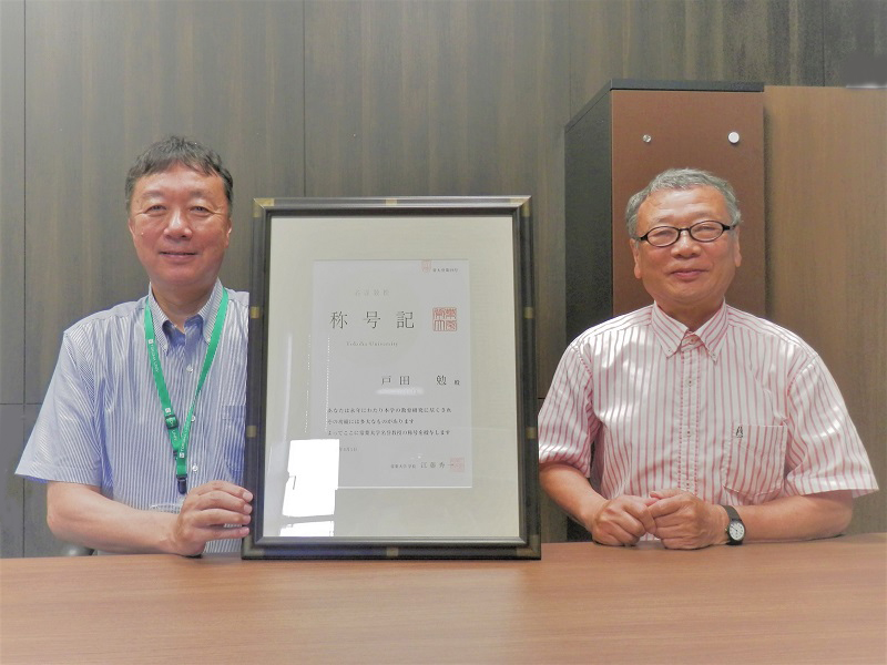 (左)戸田勉名誉教授、(右)江藤秀一学長