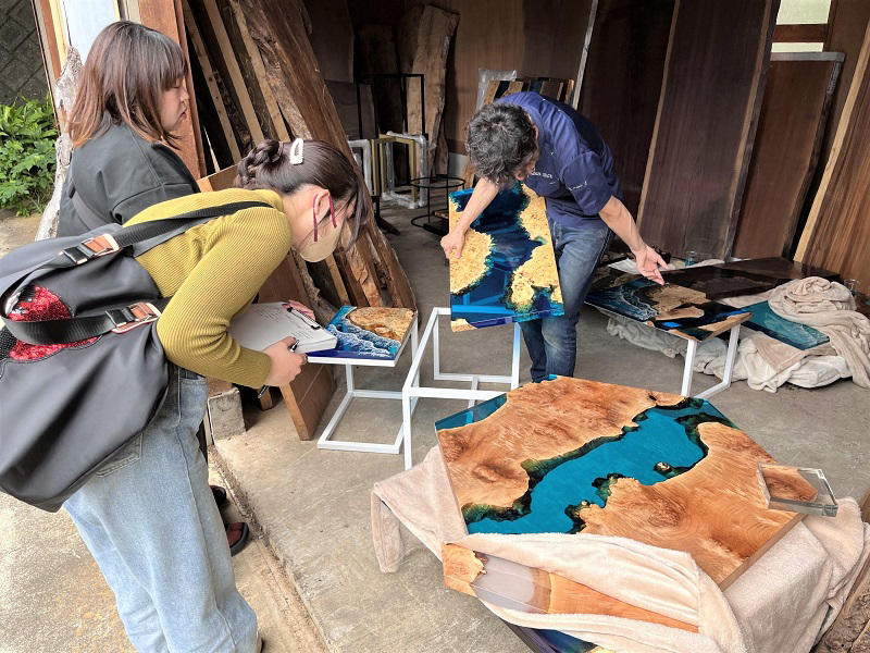 [画像クリックで拡大します] 6月7日(金曜日)、造形学部造形学科の益村凛華さん(環境デザインコース4年)が、卒業制作の取材で裾野市のRESIN SPACE様を訪問しました。 木と樹脂を組み合わせたオーダーメイドのテーブルなどで高い評価を得ており、優れたデザインとノウハウで国内でもトップレベルの会社です。 樹脂は高価であり難易度が高い素材ですが、若い学生の感性で新たなものづくりにチャレンジします。 関連リンク 造形学部 造形学部についてはこちら