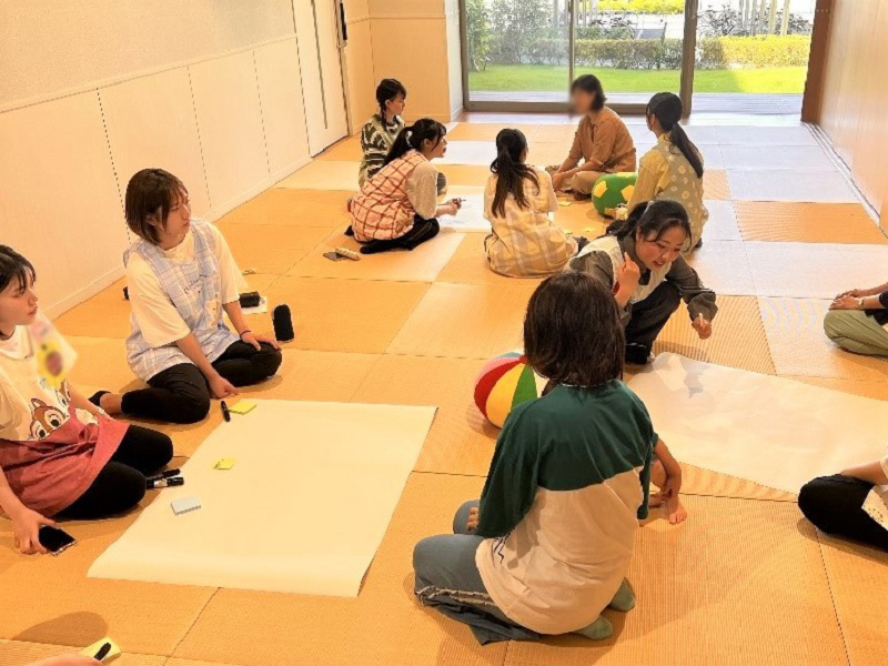 保護者の方には『最近の子育ての中で困っていること・うれしかったこと』をテーマに、保護者と学生スタッフ数名の小グループに分かれて自由にお話ししてもらい、話した内容を学生スタッフと一緒に模造紙にまとめていくワークを行ってもらいました。保護者の方には自由に話を進めてもらいながら、学生は話を受け止め、模造紙にまとめていく作業を行っていきました。その後、グループで話された内容をシェアしながら保護者同士で話を深めていく場面を設定しました。