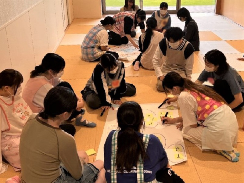 保護者の方には『最近あった〇〇・便利グッズ』をテーマに、保護者と学生スタッフ数名の小グループに分かれて自由にお話ししてもらい、話した内容を学生スタッフと一緒に模造紙にまとめていくワークを行ってもらいました。保護者の方には自由に話を進めてもらいながら、学生は話を受け止め、模造紙にまとめていく作業を行っていきました。その後、グループで話された内容をシェアしながら保護者同士で話を深めていく場面を設定しました。
