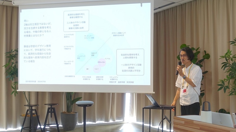 当日は、5名の教員による教育内容公開のセッションが行われ、本学造形学部の安武伸朗教授は『人間の探索と事業の構想をつなげる教育実践の報告』として、人間のより良い生活のための探求とマーケティングに象徴される産業振興とのバランスを図るデザインの授業内容を公開しました。