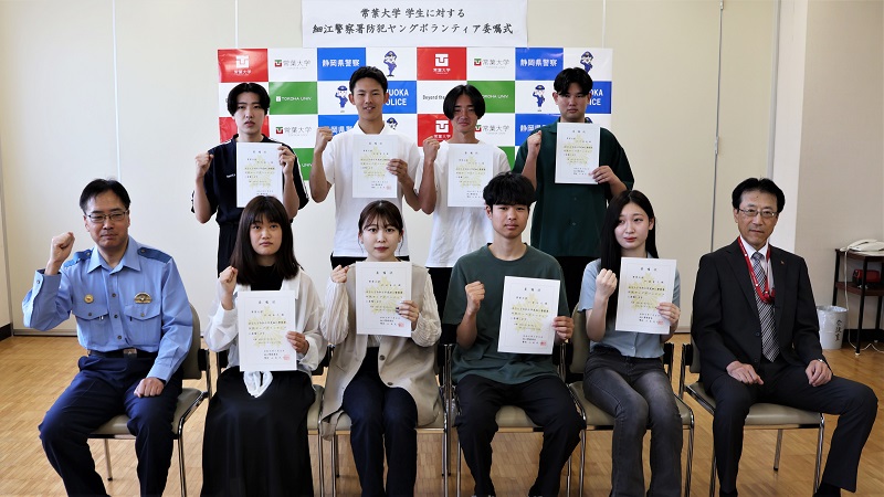 今回の委嘱式は本キャンパスと細江警察署との連携協定に基づくもので、学生らは、日頃から行っている下校見守り活動に加え、高齢者向けの特殊詐欺被害防止講座や幼稚園での防犯教室などに継続的に参加する予定です。