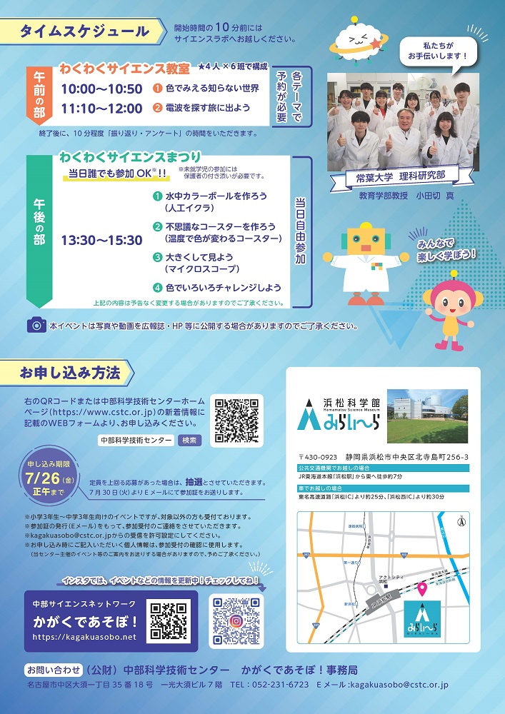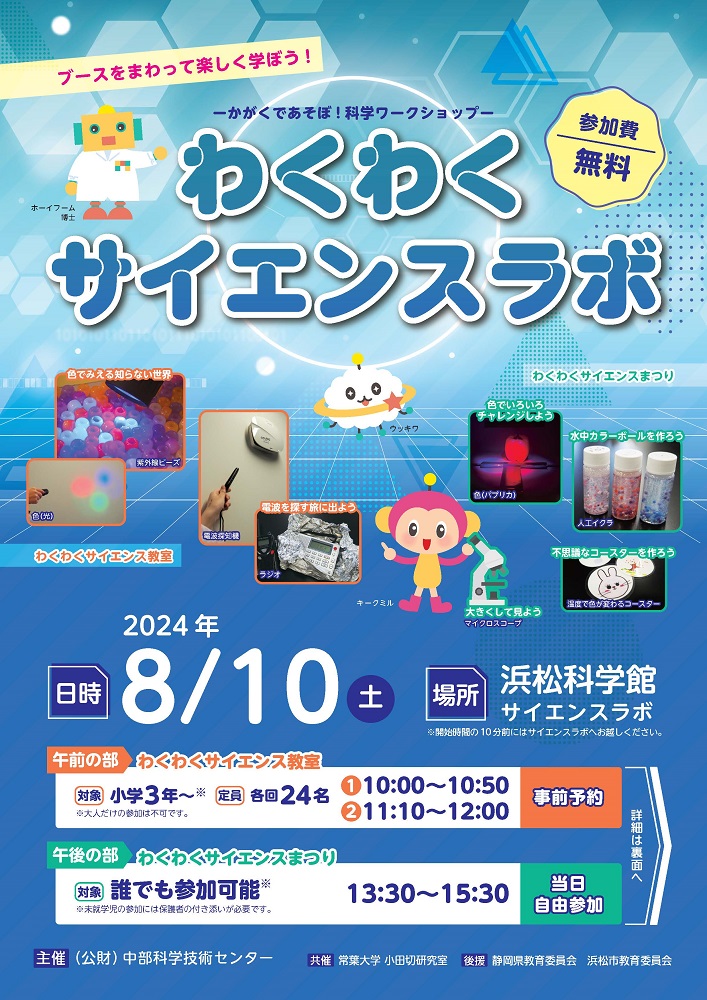 8月10日(土曜日)、浜松科学館(浜松市)にて中部科学技術センター主催『わくわくサイエンスラボ』が行われました。