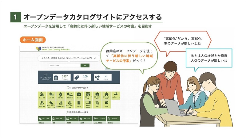 静岡県知事直轄組織デジタル戦略局データ活用推進課より依頼を受け、『ふじのくに オープンデータカタログ』の利用推進を目指した『つかい方』ページを作成しました。
