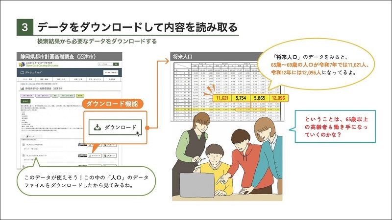 | 『つかい方』ページ 企画制作 大場心晴(3年)、大村礼那(2年)、小澤えりい(2年)、山口千鶴(1年) https://opendata.pref.shizuoka.jp/file/fujinokuni_opendata_use.pdf (別ウィンドウで開きます) |