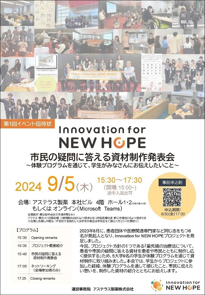 『先端治療法が1日でも早く、継続して届く社会の実現』を目指すプロジェクト:Innovation for new HOPEを2023年より安武研究室は応援しており、このたび『市民の疑問に答える資材制作発表会』が、9月5日(木曜日)にアステラス製薬本社(東京都)で開催され、同社の“学生アンバサダー”を務める担当学生が現地で発表を行いました。
