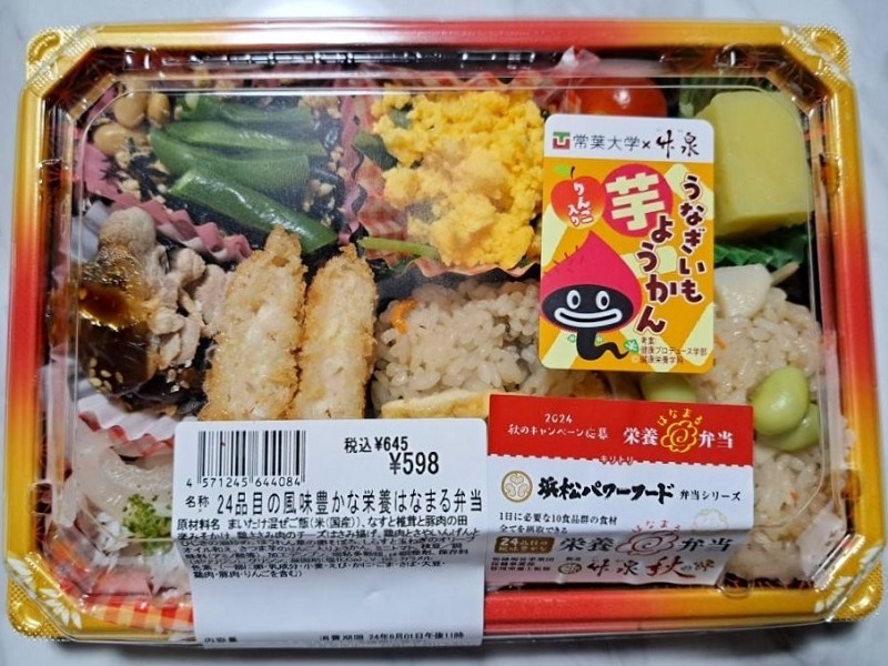 このうなぎいも羊羹は、9月1日より遠鉄ストア全店で『24品目の風味豊かな栄養はなまる弁当 第15弾 ~秋の陣~(税込価格645円)』の一口スイーツとして、また9月4日からはファーマーズマーケット東店で『うなぎいも羊羹(税込価格440円)』として販売されています。