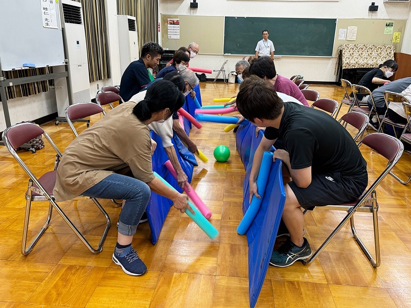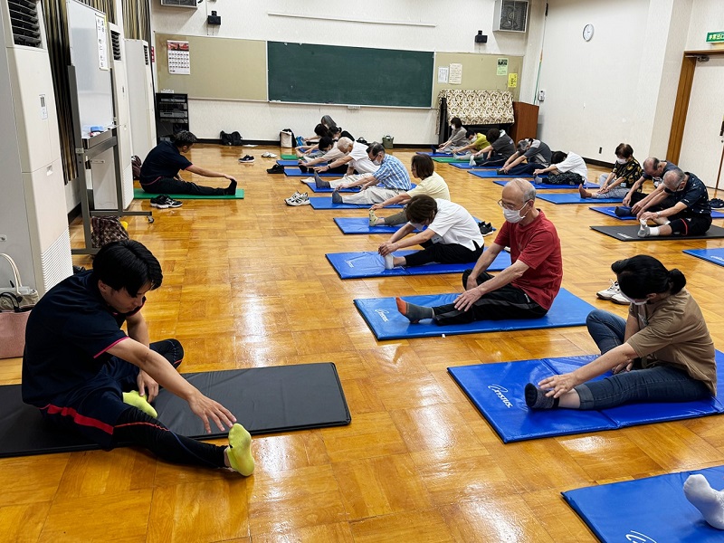 次に実技では、学生が日頃の授業(介護予防運動演習)で得た知識と指導スキルを活用し、ロコモティブシンドローム予防のための運動とストレッチを指導しました。