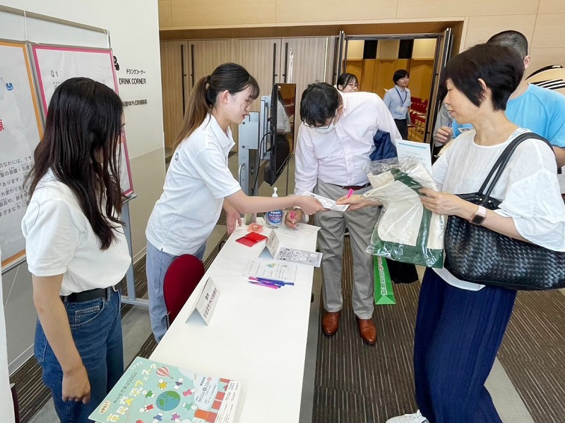 またホール外では、参加企業がブース出展しており、学生らもブースでゴミ減量動画の紹介やクイズを行い、参加者にごみ減量の目標量や意義を伝えました。