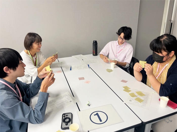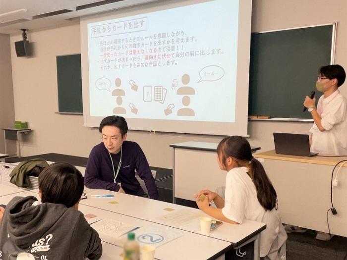 テーマとグループ替えの間には、学生スタッフが既存ゲームをアレンジしたカードゲームを行い、場を和ませていました。