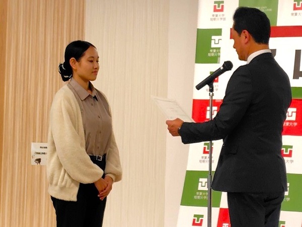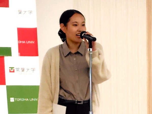 今回、『とこはMIRAIフェロー』の称号を授与された短期大学部日本語日本文学科2年の田村夏海さんは、学修ピアサポーター、図書館サポーター及び学友会の3種類の活動修了が認められました。本人によると、経済産業省が提唱する『社会人基礎力』の中でも、『チームで働く力』が身についたそうで、チーム内の情報共有ができるようになったそうです。実際に彼女が進行を務めた『公務員の仕事研究座談会』でも、当日の小さなトラブルに周囲の学生を巻き込み、迅速に対応できていました。